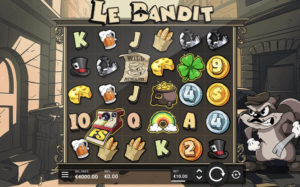 Le Bandit Hacksaw Gaming spēle stilistiski ir tāds kā animācijas seriāls – drusku komikss, drusku gangsteru stāsts. Galvenais varonis ir jenots Smokey, kas laistās pa Parīzes aizmugures ielām, noķer dažādas “trofejas” un pa ceļam iedvesmo monētas birt tavā kontā.